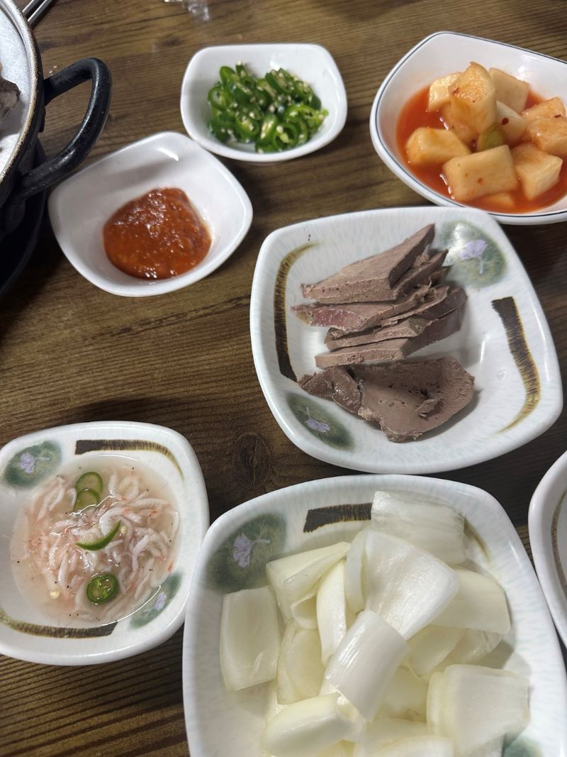 기본 찬 세팅을 해주셨습니다. 성시경 님이 극찬한 간이 나왔습니다. 진짜 푸아그라, 안키모 식감입니다. 녹진하면서 부드럽고 맛있었습니다. 깍두기는 조금 단맛이 있긴 했으나 순대국하고 먹기 좋았습니다.