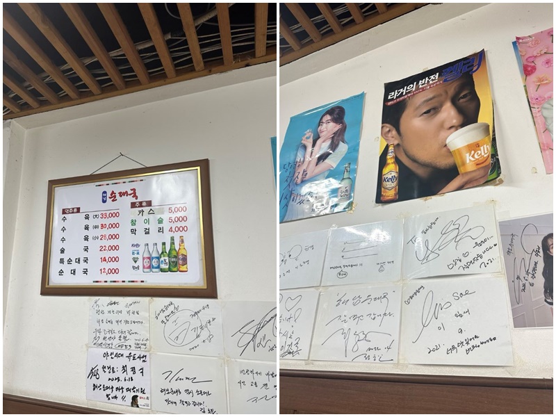 양쪽 벽면마다 연예인 사인이 한가득입니다. 가격이 조금씩 오른 듯합니다. 순대국 12,000원 가격은 조금 비싼 듯합니다. 수육은 小와 大 차이가 5천 원이네요.