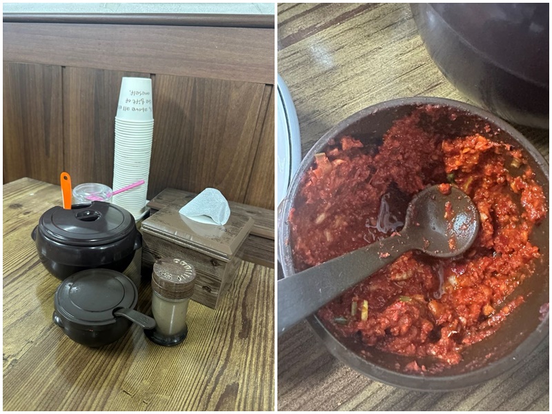 테이블에 놓인 기본 세팅입니다. 깍두기, 소금, 후추, 소금, 양념장(다대기) 양념장이 별도로 비치되어 있습니다. 취향껏 추가해서 드시면 됩니다.