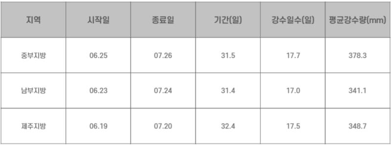 제주도 지역이 장마 평년값이 가장 크게 나타 났습니다.